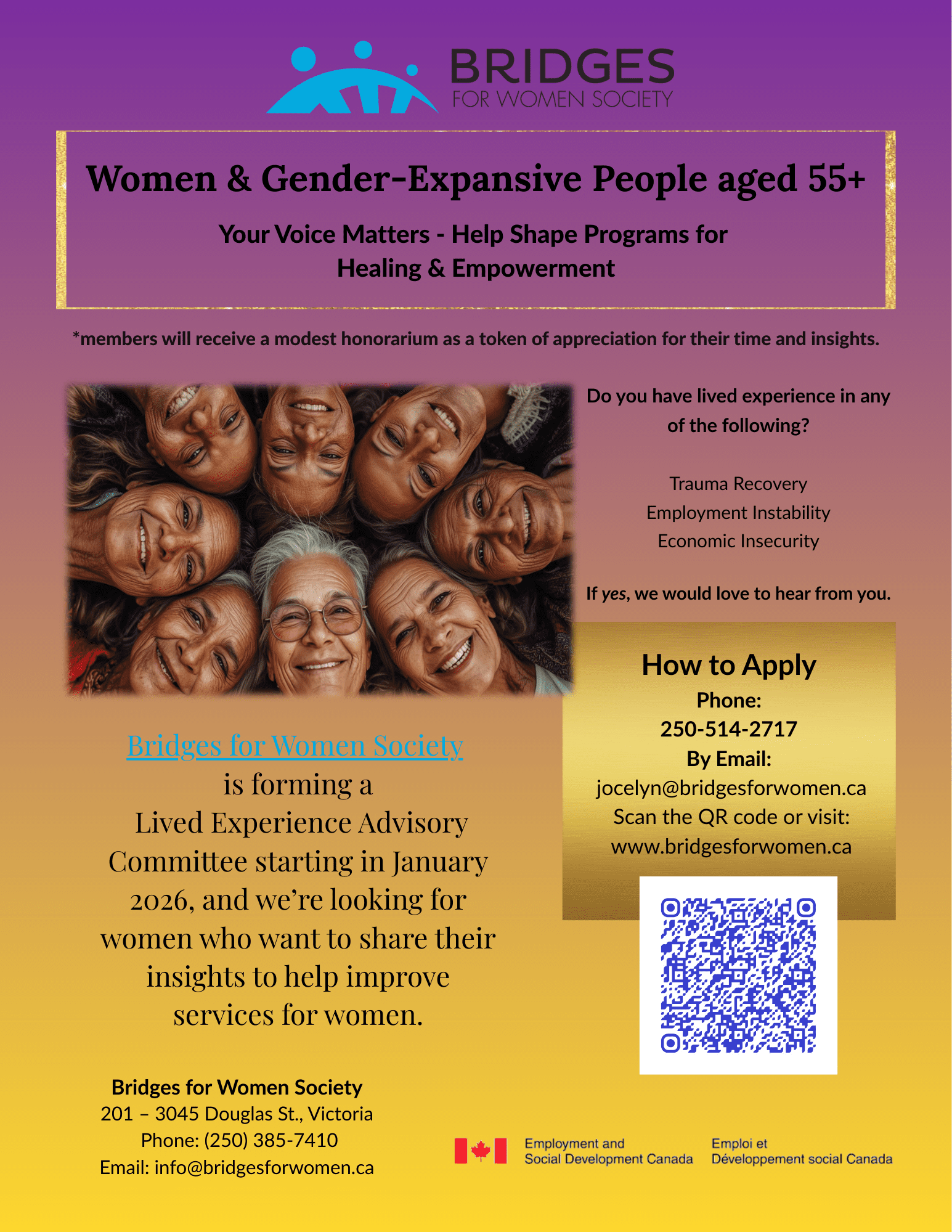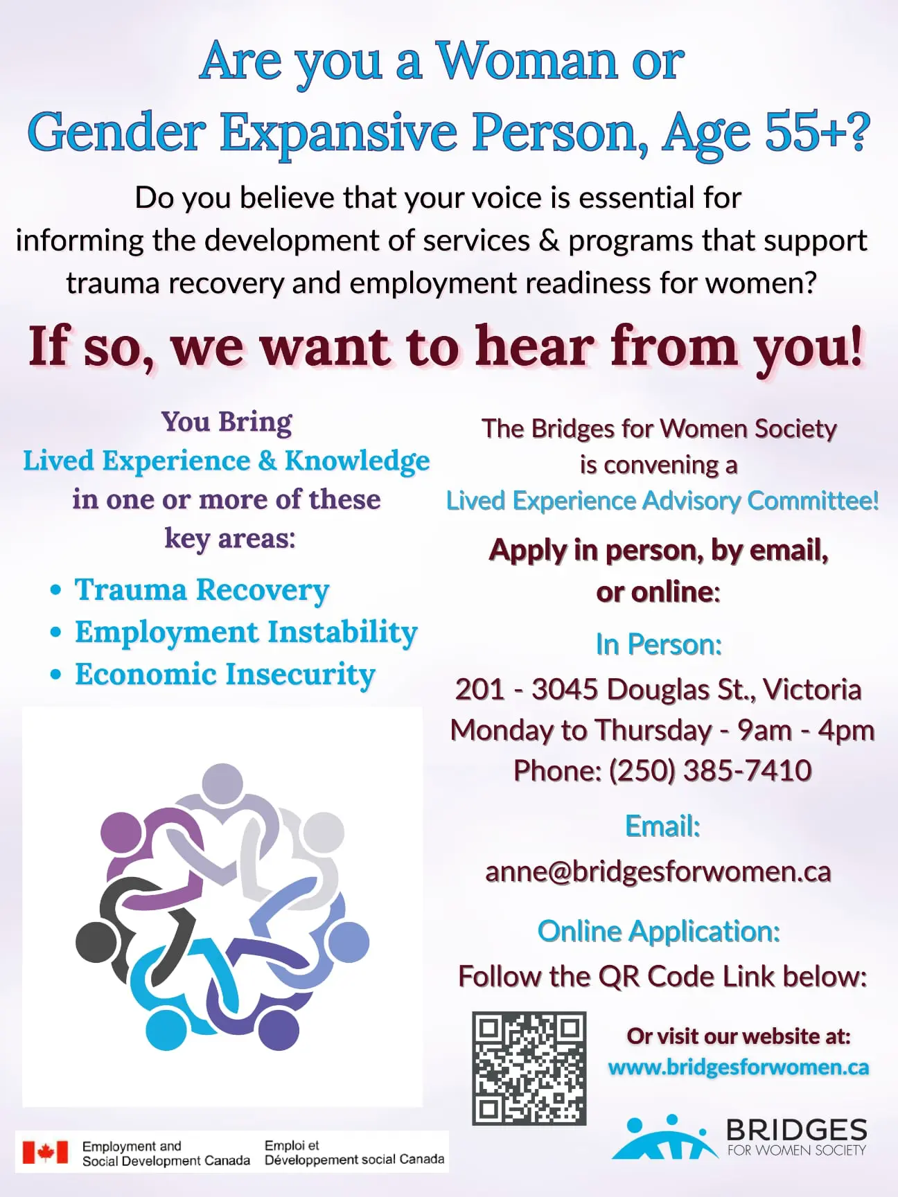 The Bridges for Women Society is currently seeking interested Lived Expertise Applicants to work with us on the development and ongoing work of an advisory committee for the organization.
